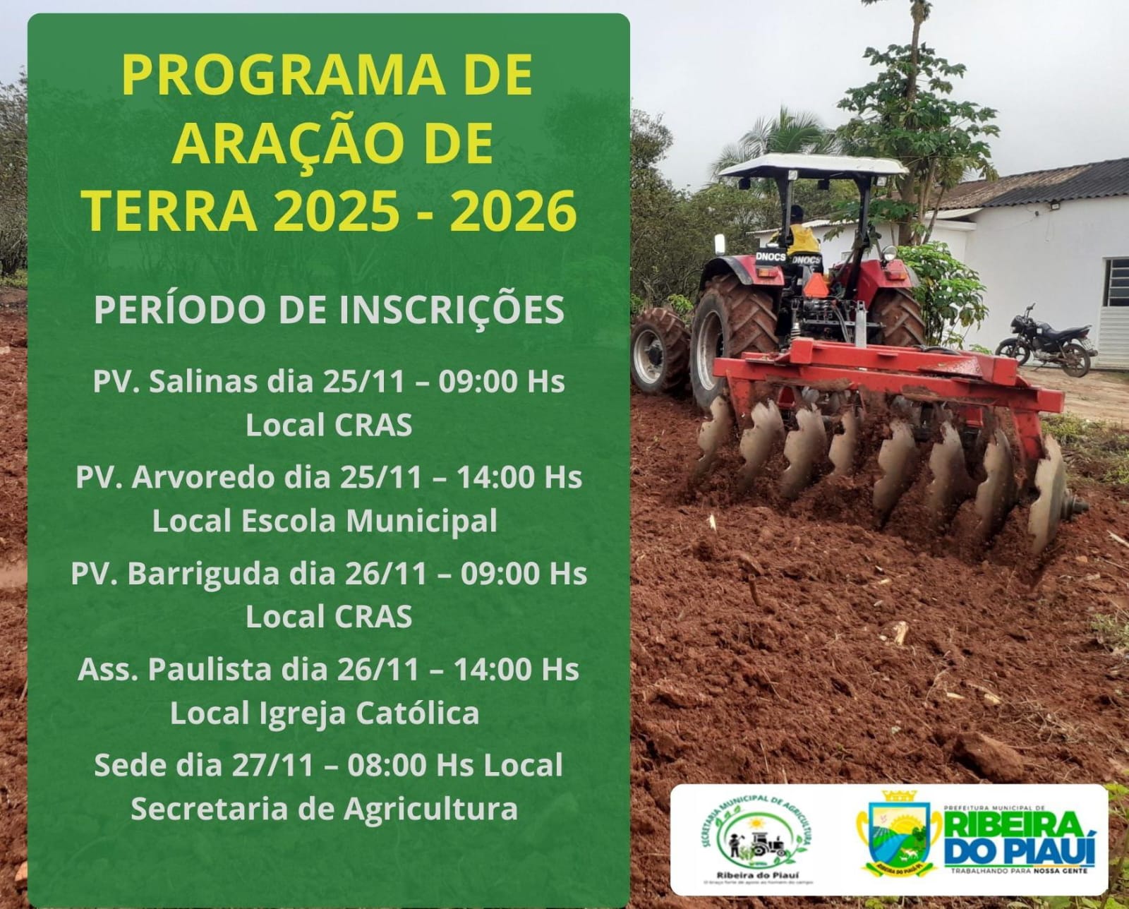 PREFEITURA DE RIBEIRA DO PIAUÍ DIVULGA CALENDÁRIO DE INSCRIÇÕES DO PROGRAMA DE ARAÇÃO E TERRA E ENTREGA DE BOLETOS DO GARANTIA SAFRA 2025/2026