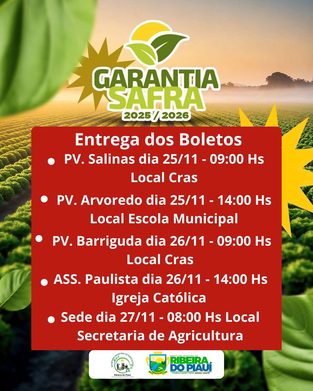 A Prefeitura de Ribeira do Piauí, por meio da Secretaria Municipal de Agricultura, informa aos agricultores do município o calendário oficial para as inscrições do Programa de Aração de Terra 2025/2026 e para a entrega dos boletos do Garantia Safra 2025/2026.