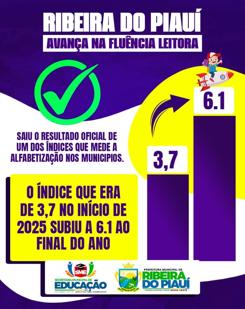 Ribeira do Piauí apresentou um avanço significativo na fluência leitora, um dos indicadores que avaliam o processo de alfabetização nos municípios. O índice, que no início de 2025 era de 3,7, alcançou a marca de 6,1 ao final do ano, evidenciando o fortalecimento das ações pedagógicas, o compromisso dos profissionais da educação e os investimentos realizados no acompanhamento da aprendizagem, refletindo melhorias concretas no desempenho dos estudantes da rede municipal.